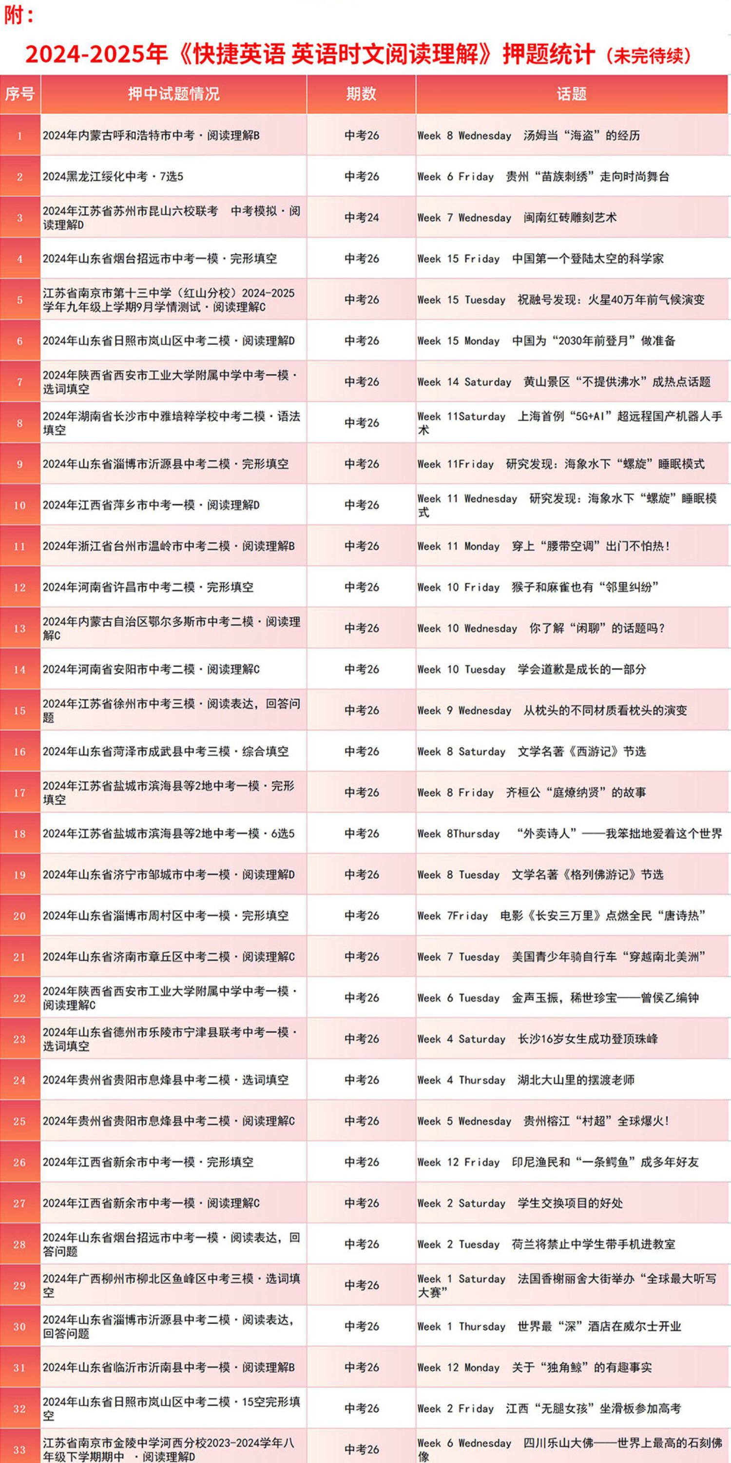 2026新版30期29期快捷英语时文阅读小学版三四五六年级小升初七八九年级高中英语完形填空与阅读理解写作组合专项训练英语热点题型